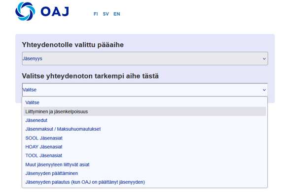 Valitse pudotusvalikosta yhteydenoton tarkemmaksi aiheeksi ”Liittyminen ja jäsenkelpoisuus”.